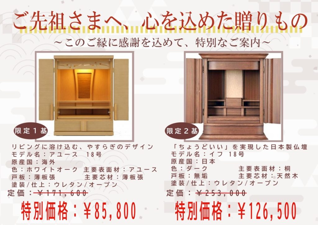 今回はクーポン券の他に御仏壇を限定で特別価格にてご奉仕いたします。