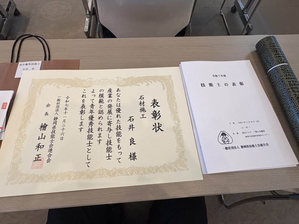 さて、このたび当社の工場長である石井良(一級技能士)が、静岡県技能士連合会より青年優秀技能士として表彰されました。