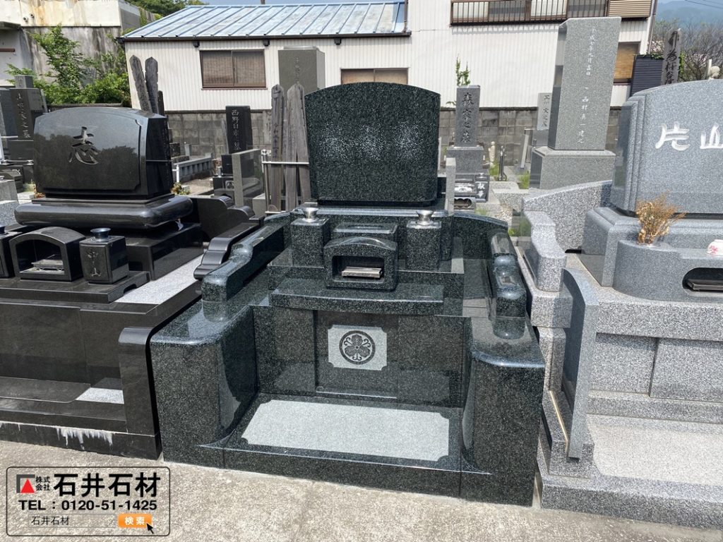 まず初めにご紹介するのは、インド産で深い緑系の御影石(M-1-H)を使用した上品で落ち着いた佇まいのお墓です。