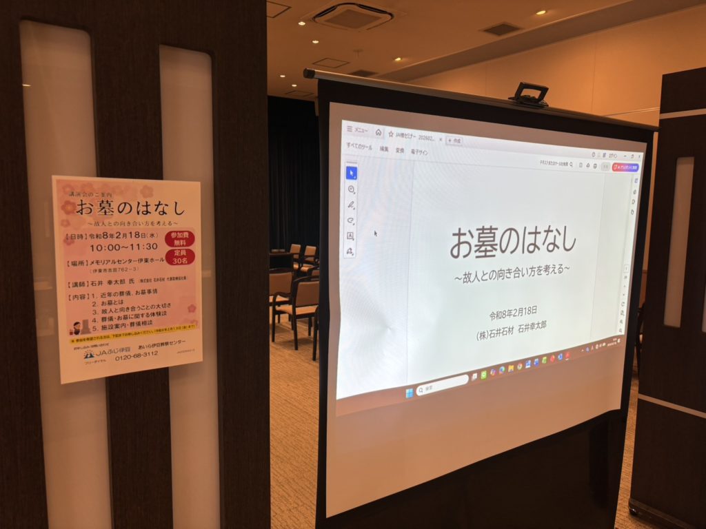 先日、JAふじ伊豆 あいら伊豆葬祭センター様の吉田ホールにて、お墓や終活をテーマにしたセミナーを開催させていただきました。